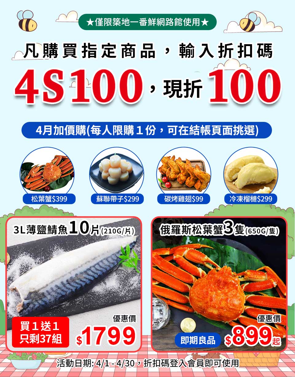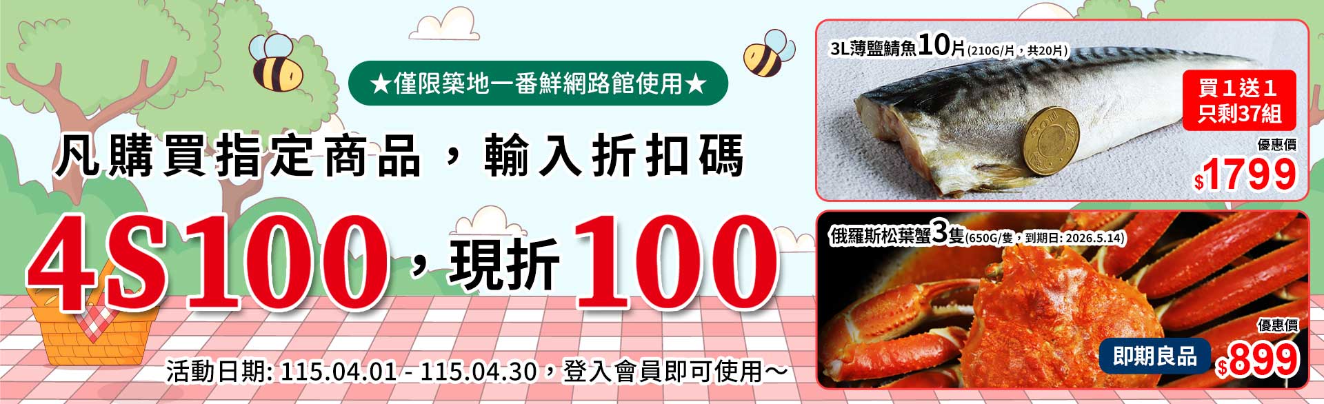 ☛ 4/1-4/30|★輸入折扣碼現折100:4S100