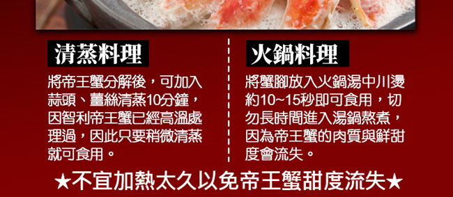 2. 帝王蟹火鍋料理:將帝王蟹腳放入火鍋湯中川燙約10~15秒既可食用,切勿長時間進入湯鍋熬煮,因為蟹的肉質與甜度會流失。