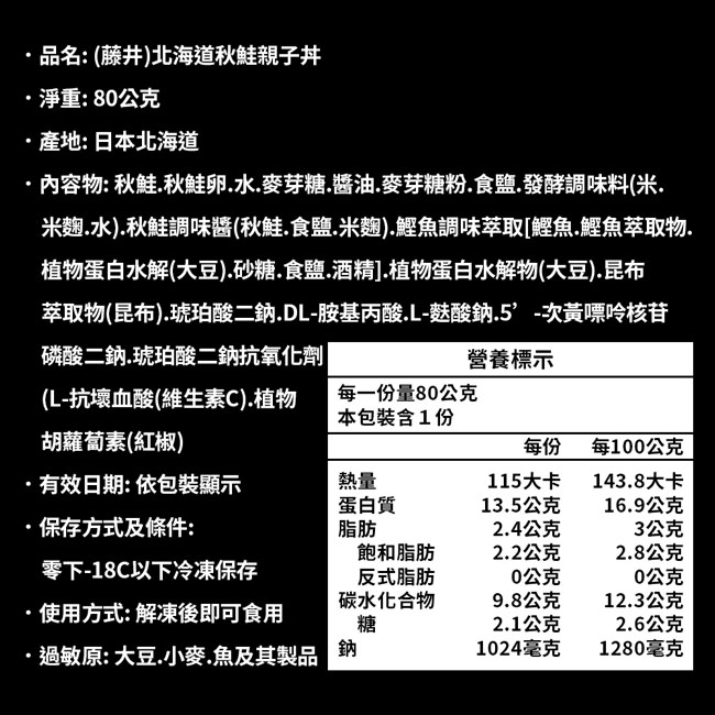 .商品名稱:北海道|親子丼|鮭魚卵 × 鮭魚片|80g盒|4盒