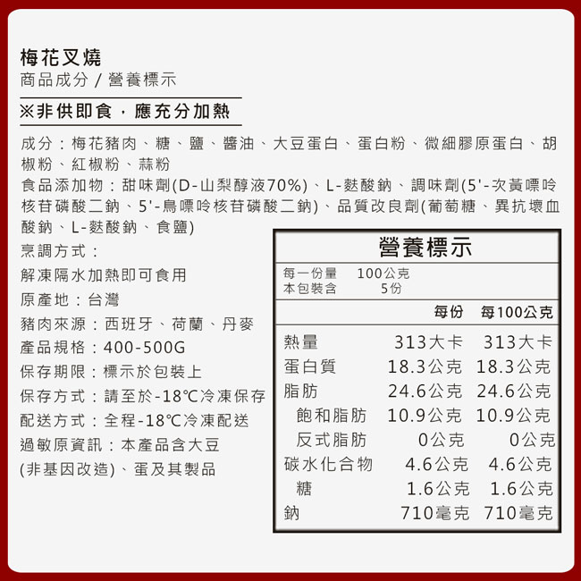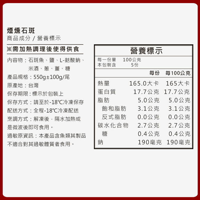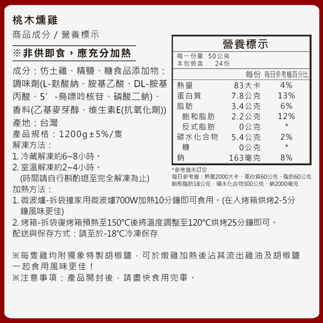 .食用方式:煙燻石斑(覆熱食品,需烹煮至熟即可食用)、叉燒肉(覆熱食品,需烹煮至熟即可食用)、桃木燻雞(覆熱食品,需烹煮至熟即可食用)