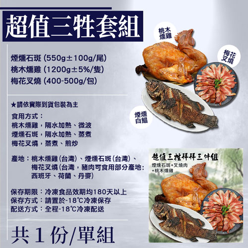 .商品名稱:三牲|煙燻石斑+叉燒肉+桃木燻雞