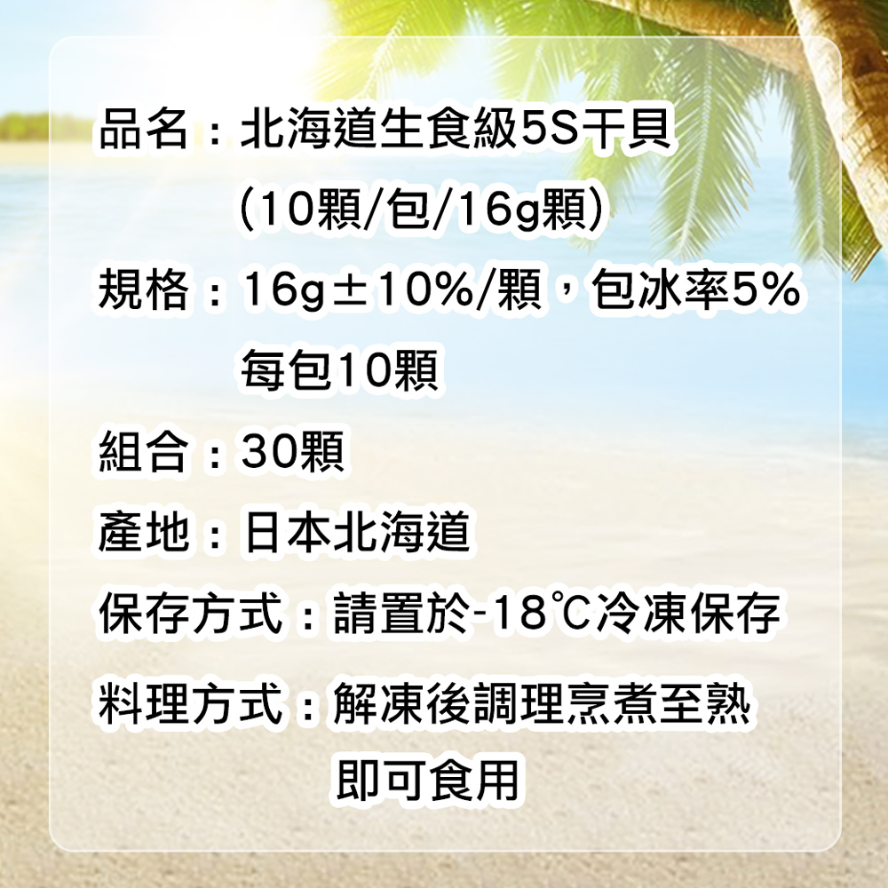 ‧●商品名稱:生食級|5S北海道干貝500g|3包(10顆裝/包)