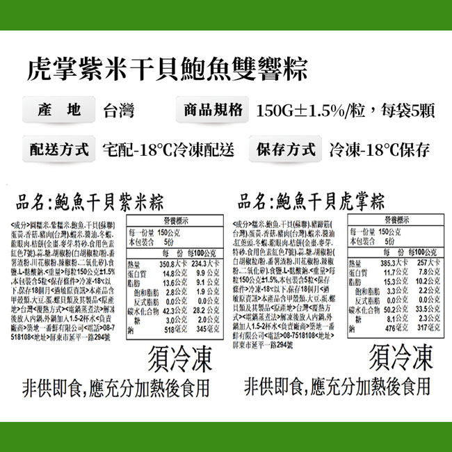 .規格數量:150g±1.5% / 顆,5顆 / 包,共收到1組(紫米粽5粒/包 + 虎掌粽5粒/包)