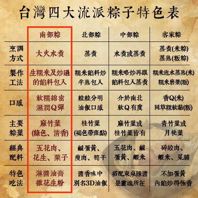 採用正宗水煮南部粽工法,讓米食吸收粽葉的清香與食材的精華
