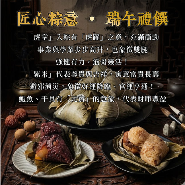 .商品名稱:干貝鮑魚雙享粽|紫米粽5粒+虎掌粽5粒|150g/顆