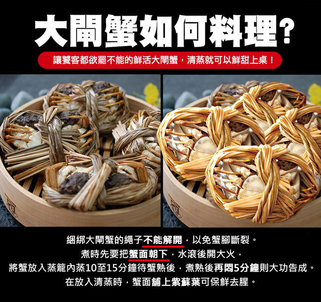 ★煮時先要把蟹面朝下,水滾後開大火,將蟹放入蒸籠內蒸10至15分鐘待蟹熟後,