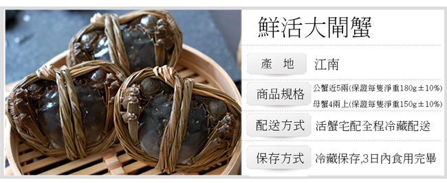 公蟹:近5兩/隻 ,每隻淨重約180g±10%