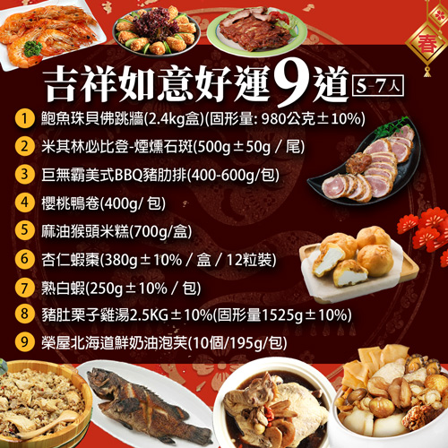• 商品名稱:年菜|吉祥如意雞湯石斑|9道組|7菜2湯|5-7人