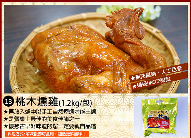 13. 桃木燻雞:如圖所示(依商品包裝標示為準)