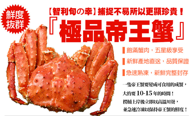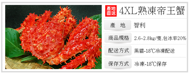 ●商品名稱:4XL尺寸|熟凍|智利帝王蟹2.6-2.8kg|1隻