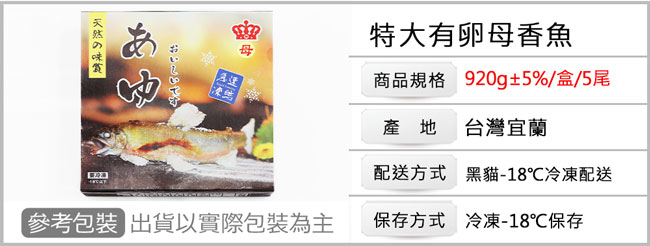 .商品名稱:特大|爆卵母香魚5尾|920g|1盒|任選