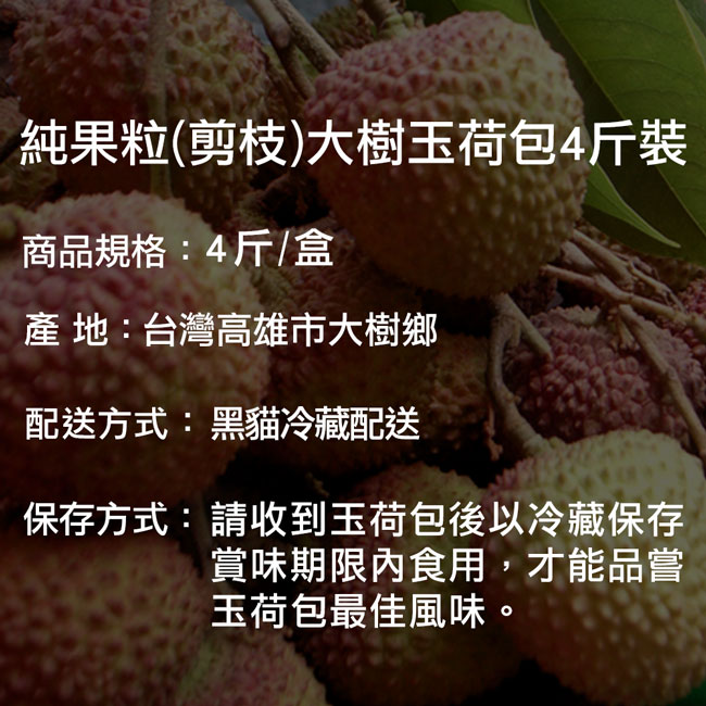 .商品名稱:纯果粒|高雄大樹|玉荷包荔枝|4斤1盒