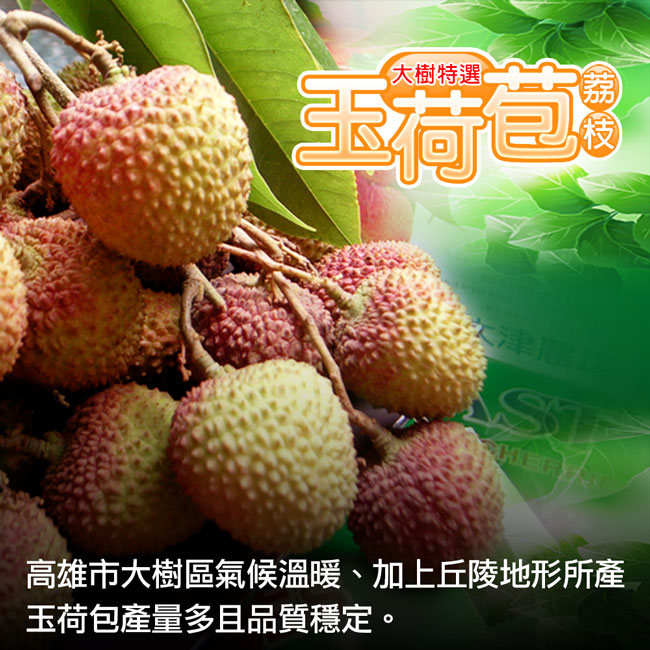 高雄市大樹區氣候溫暖、加上丘陵地形所產玉荷包產量多且品質穩定。 果肉多Q且結實,甜度18度以上入口有花香果香(甜潤)+ 蜜香的滋味 端午節前後為玉荷包盛產期 果肉達到最飽滿,是端午送禮最佳首選