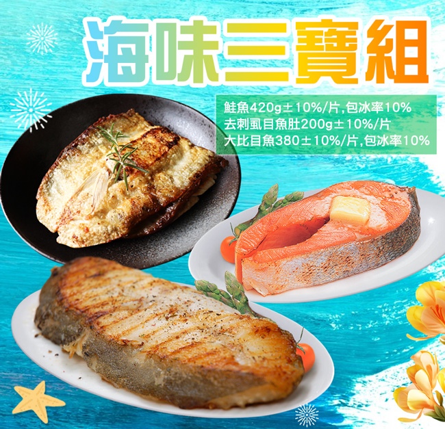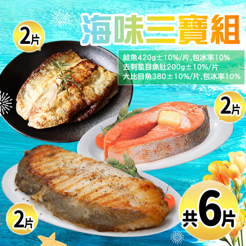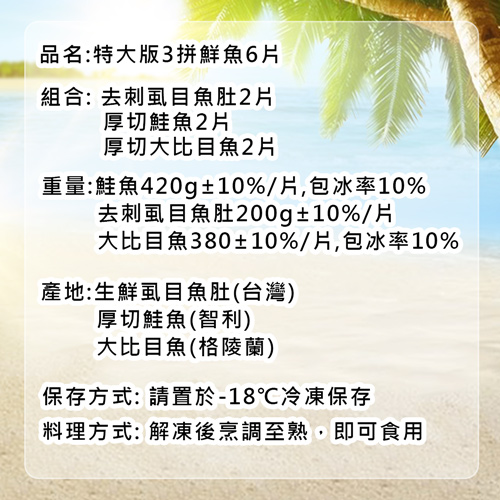 .商品名稱:特大版3拼組|大無刺虱目魚肚+厚切鮭魚+厚切大比目魚|各2片|免運