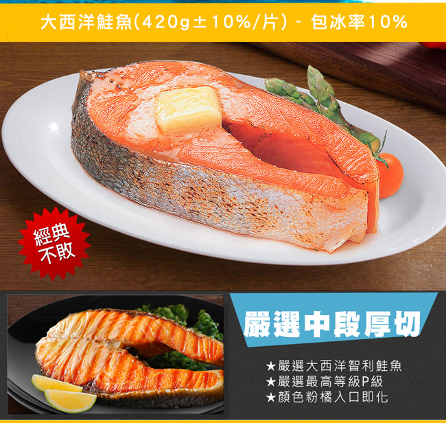 虱目魚肚(200g±10%/片)、鮭魚(420g±10%/片,包冰率10%)、大比目魚(380g±10%/片,包冰率10%),
