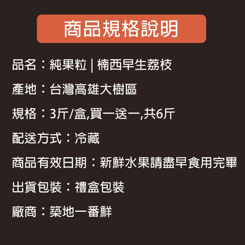 .商品名稱:純果粒|買3斤加贈3斤|楠西早生荔枝|3斤盒