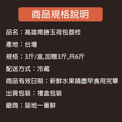 .商品名稱: 3斤加贈3斤|純果粒|高雄南勝玉荷包荔枝|3斤/盒