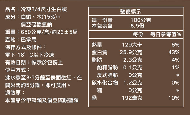 ●食品添加物:白蝦、水、偏亞硫酸氫鈉。過敏原:甲殼類.偏亞硫酸鹽類。如圖所示(依實際到貨外包裝為主)