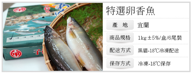 .商品名稱:巨無霸宜蘭爆卵母香魚2盒(6尾裝/1kg/盒)