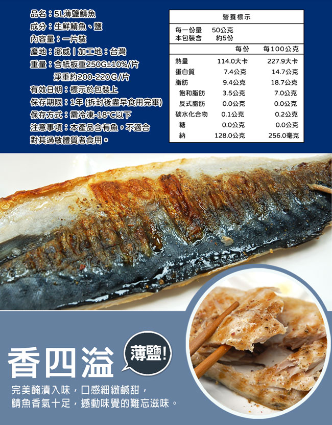 .商品名稱:5L大挪威薄鹽鯖魚9片(250g/片) 免運
