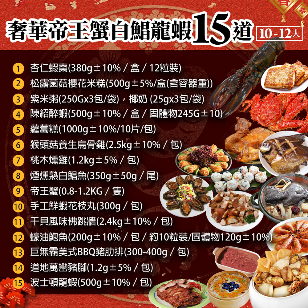 奢華帝王蟹白鯧龍蝦15品年菜組(15道/13菜2湯/10-12人)