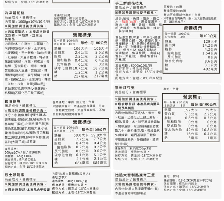 生鮮食品,解凍後料理烹煮至熟即可食用:帝王蟹、Q嘟嘟花枝丸、龍蝦