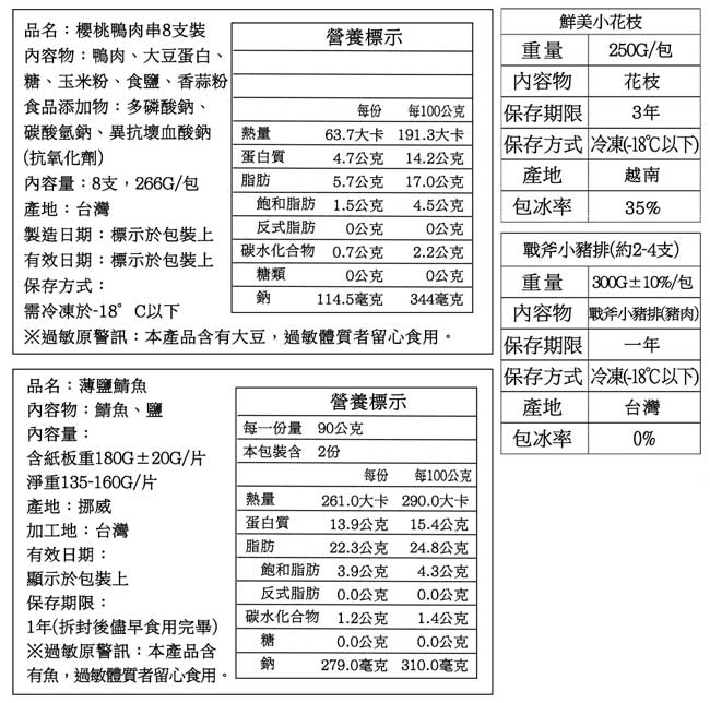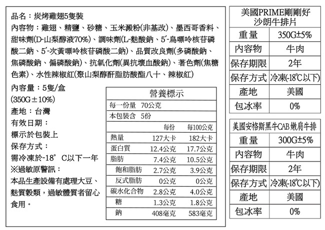 ‧●產地:沙朗牛排(美國)、嫩肩牛排(美國)、小花枝(越南)、雞翅(台灣)、薄鹽鯖魚(挪威)、