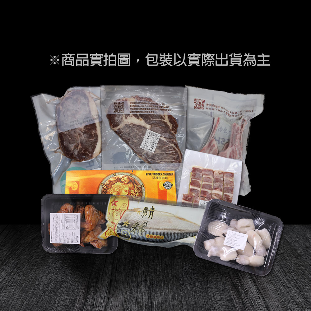 ‧●內容物名稱:沙朗牛排、嫩肩牛排、小花枝、雞翅、薄鹽鯖魚、鴨肉串、白蝦、戰斧小豬排