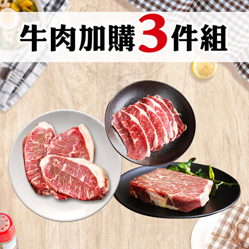 | (1)牛肉3件組_加購499 | (2)禽肉4件組_加購399 | (3)海鮮4件組_加購599 |