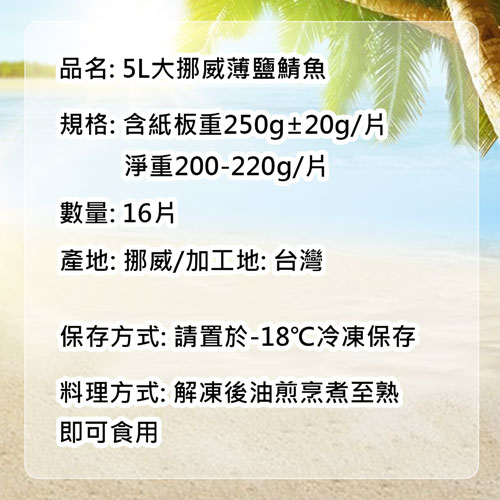 .商品名稱:5L大挪威薄鹽鯖魚16片(250g/片) 免運