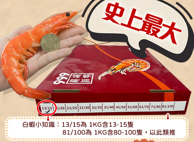 ●商品名稱:蝦王巨無霸|13/15熟白蝦1kg|1盒