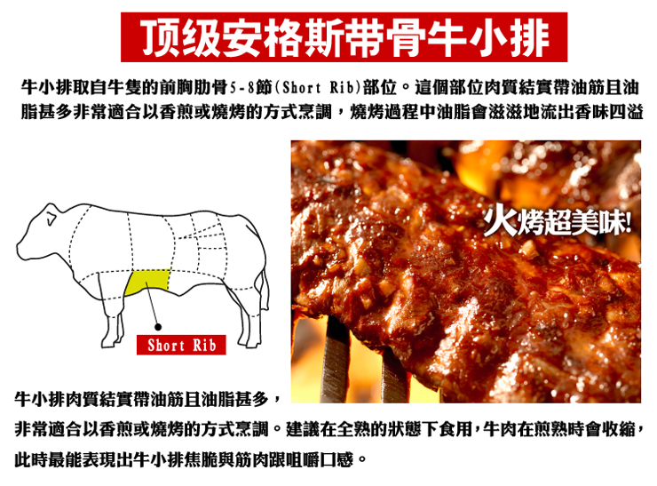 牛小排肉質結實帶油筋且油脂甚多,非常適合以香煎或燒烤的方式烹調。