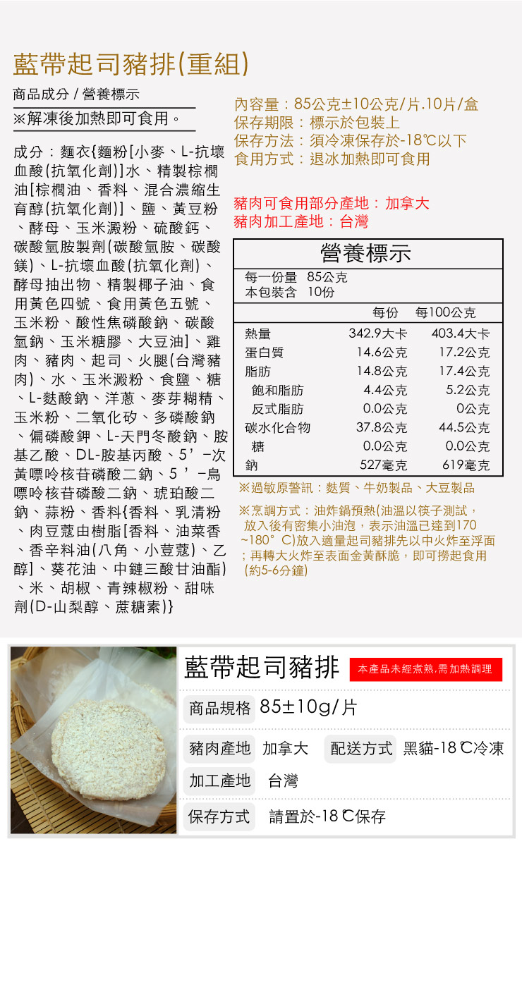 .規格數量:藍帶起司豬排(重組肉):85g±10g/片,每包10片裝,共收到40片