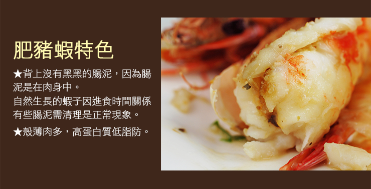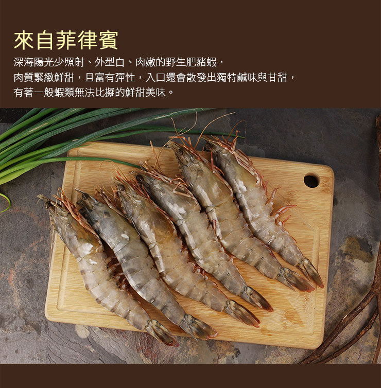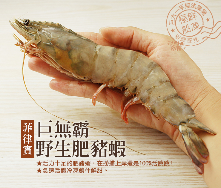 野生肥豬蝦生活在菲律賓深200公尺以下海域的野生草蝦,無陽光照設,身體偏白,外型比草蝦白,而肉質有嚼勁不輸小龍蝦,俗名叫「肥豬蝦」(又肥又白!!)