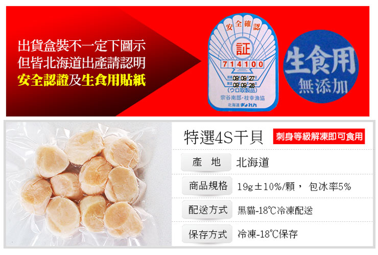 •商品名稱:4S 北海道生干貝x10顆(19g/顆) *生食等級*真空包裝*_任選