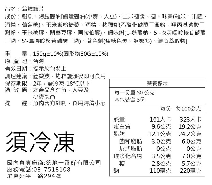 .商品名稱:外銷日本鮮嫩蒲燒鰻魚1包(150g/包)-任選