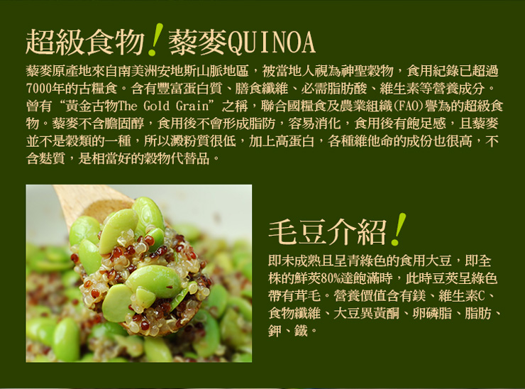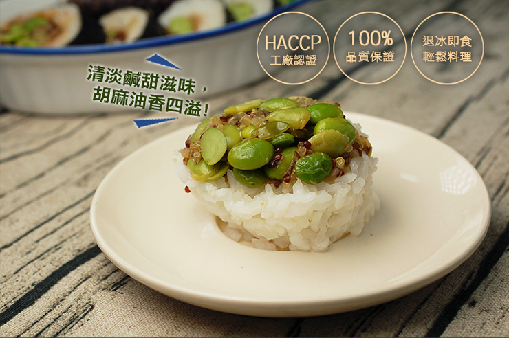 .產地:月亮蝦餅(如圖所示,(產地:台灣。豬肉可食用部分產地:台灣))、藜麥毛豆(台灣)