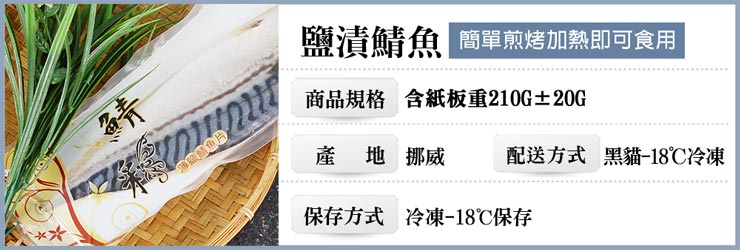 •商品名稱:★買1送1★厚片超大油質豐厚挪威薄鹽鯖魚10片(210g/片 加贈10片共20片)