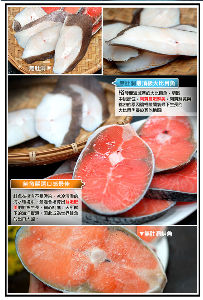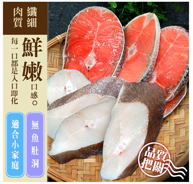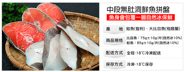 大比目魚75g/片(自然冰10%)、鮭魚85±10g(自然冰10%)