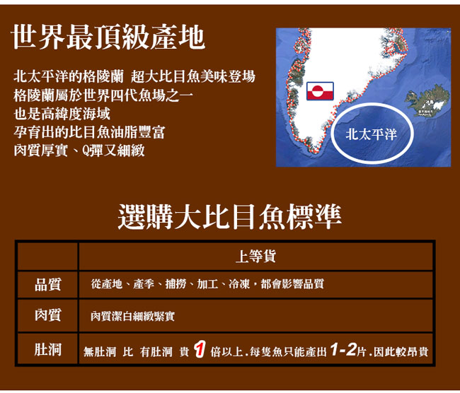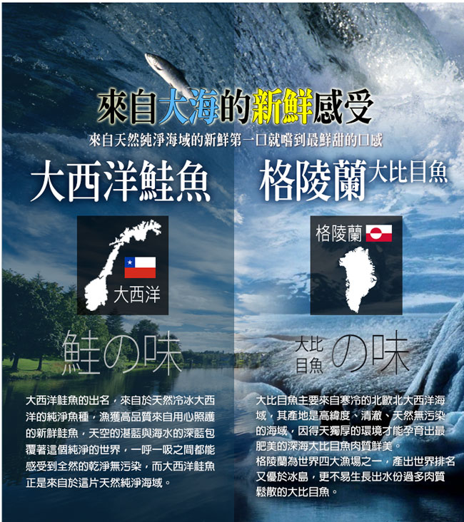 .產地:大比目魚(格陵蘭)、鮭魚(智利)
