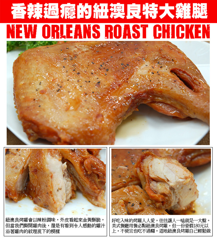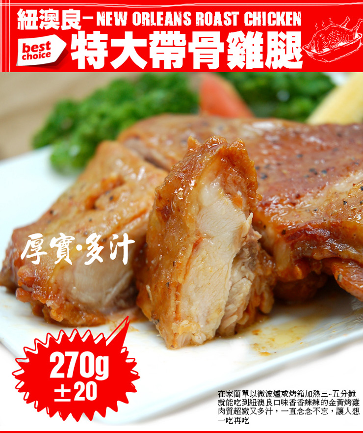 ‧●規格數量:日式醬燒雞腿排(200g±10%/隻)、紐奧良雞腿(270g±20g/隻)