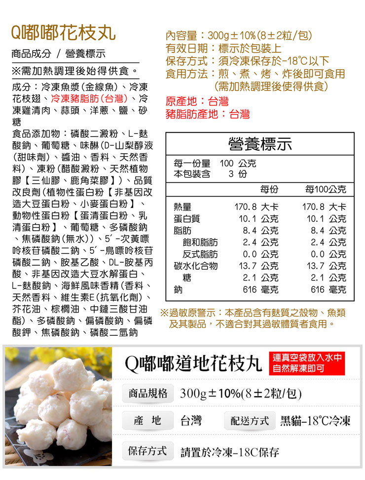 ●內容物名稱:5S干貝10顆、嫩肩肉片、Q嘟嘟花枝丸、草蝦、蟹味棒、梅花豬、金湯