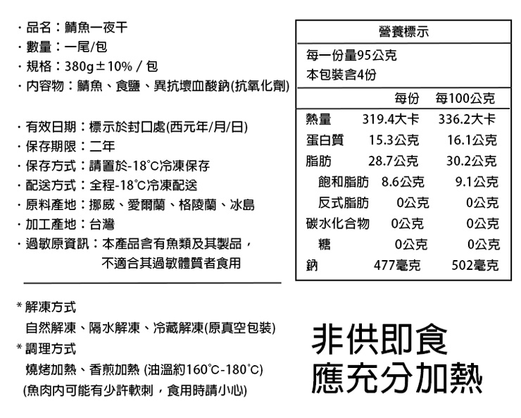 .食用方式:桃木燻雞(解凍後烹煮料理油煎至熟即可食用)、鯖魚一夜干(生鮮食材,需烹煮至熟)、紅燒蹄膀(覆熱食品,隔水加熱.微波)