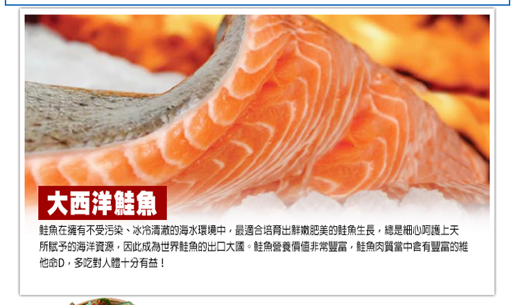 嚴選智利大西洋鮭魚,肉身為橘色(Omega-3顏色)、是世界優質鮭魚品種。
