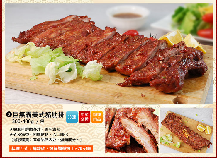3.巨無霸美式BBQ豬肋排:如圖所示(依商品包裝標示為準)
