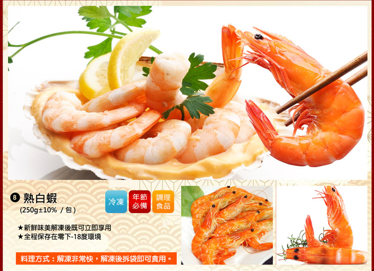 解凍即食,解凍後料至熟理即可食用:熟白蝦