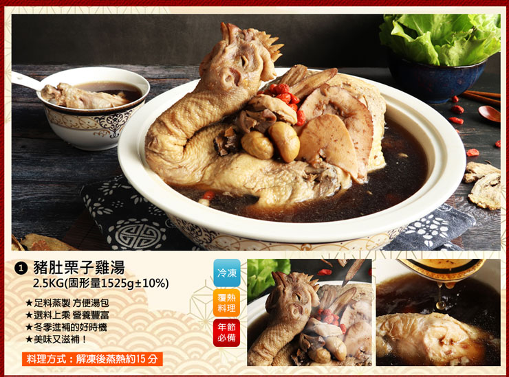 1.豬肚栗子雞湯:如圖所示(依商品包裝標示為準)
