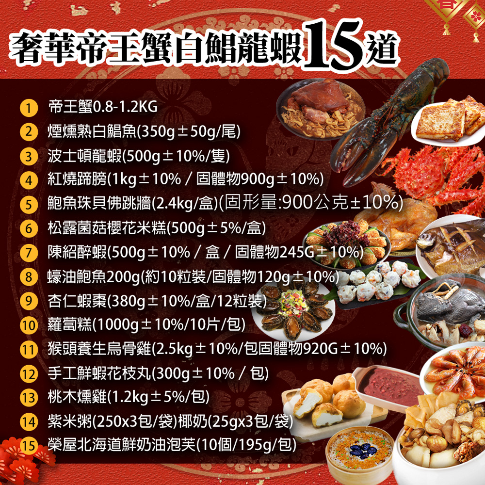 年菜|15品奢華帝王蟹白鯧龍蝦|15道組|13菜2湯|12-14人