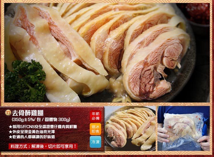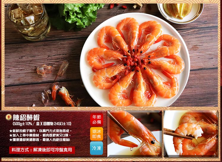 解凍即食,解凍後料理即可食用:醉雞腿、陳紹醉蝦