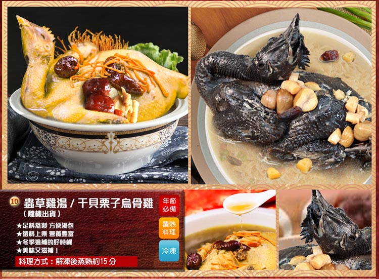 12.蟲草雞湯 / 干貝栗子烏骨雞:台灣(如圖所示)